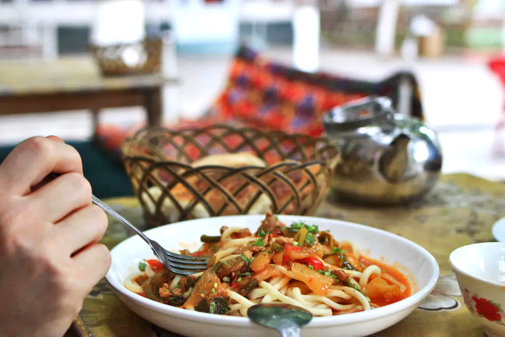 Beim uighurischen Laghman ist die Hauptzutat namensgebend. Laghman sind lange handgezogene Nudeln, die entweder gebraten als Nudelgericht mit Fleisch und Gemüse oder als Suppe zubereitet werden. Das Rezept ist, wie der Name verrät, uighurischen aber auch dunganischen Ursprungs, letztere eine muslimisch-chinesische Minderheit, die vor allem in den ehemaligen Sowjetrepubliken beheimatet ist. Die autonome Region Xinjiang, die im Nordwesten Chinas liegt und in der zahlreiche Minderheiten, wie die turksprachigen Uighuren leben*, grenzt im Westen an Kasachstan, Kirgistan und Tadschikistan. Es verwundert also nicht, dass diese leckeren Nudeln über Landesgrenzen hinweg, in der ganzen Region beliebt sind. In Kirgistan und Usbekistan gelten sie sogar als eines der Nationalgerichte.