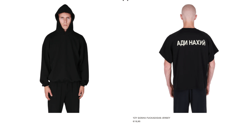 Mit der Vorgeschichte begann also die Kollaboration zwischen West und Rubchinsky. In Wests Online-Shop kann man heute für je 20 $ diverse T-Shirts, Hoodies und Socken mit kyrillisch-russischen Aufschriften, die an Altkirchenslawisch erinnern sollen und damit einen Link zum Russisch-Orthodoxen Christentum herstellen, kaufen, darunter ФАК АДИАДАС (FUCK ADIDAS), АДИ НАХУЙ (VERPISS DICH ADI) oder ЧЕРНЫЕ ПСЫ (SCHWARZE KÖTER). Zwei Unternehmer, die offensichtlich nicht im Gutem mit Adidas auseinandergegangen sind, wollen es dem deutschen Unternehmen heimzahlen.